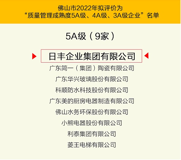继去年荣获“2021年佛山市政府质量奖”后,近日,日丰集团连获——佛山市2022年度企业质量管理成熟度5A级企业和“第七届广东省政府质量奖提名奖”两项殊荣。这两项荣誉获得,是政府对日丰管高质量发展的充分肯定和认可。