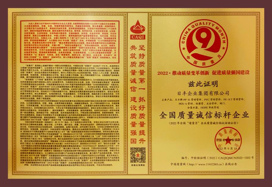 长期秉持着“质量之上”的理念,日丰集团深耕管道行业26年,坚持创新驱动发展,恪守高质量标准,匠心研制出PPR管、PVC管、PE-RT管、HDPE市政管等高质量的日丰管产品,沉淀深厚的品牌影响力和企业实力。此次全国质量月活动中,日丰集团更是一举包揽“全国管材管件制造行业质量领先品牌”、“全国管材管件制造行业质量领先企业”、“全国质量检验信誉保障产品”等9项证书,在品牌、企业、产品多方面摘得丰富硕果,足以见证各界对于日丰集团综合实力的权威认可,更肯定了其多年来身为头部民族品牌承担的质量示范带头作用。