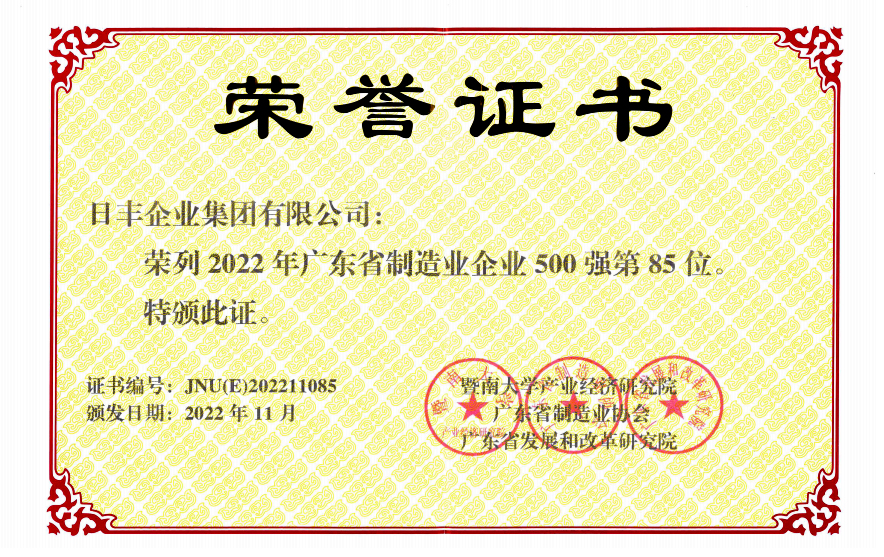 作为我国经济第一大省的广东,是国家制造业的命脉所在,由此在广东诞生并扎根的企业,总是成为全国制造业的排头兵,挺立在世界潮头。孕育并成长于广东改革开放前沿的日丰集团,近日凭借卓越的制造实力,与旗下日丰管产品共同硬核出圈,再度荣登广东制造业500强荣誉榜单,持续彰显管道行业一流企业强劲的制造实力和持续稳健的发展态势。