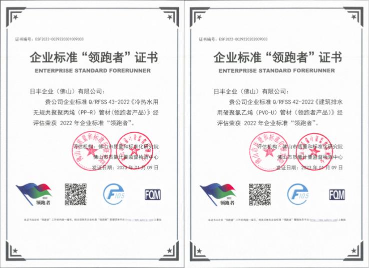 据介绍,企业标准“领跑者”制度是国家市场监管总局等八部门提出的鼓励性政策,通过高水平标准引领,对重点领域内企业按照核心指标高于国家标准及行业标准的原则,综合评估产生年度企业标准的“领跑者”名单。此次日丰PPR管、日丰PVC-U管分别获颁“领跑者”证书,源自于日丰集团长年累月对于产品的匠心精造,以及对于主导或参与行业“领跑者”标准的责任担当。